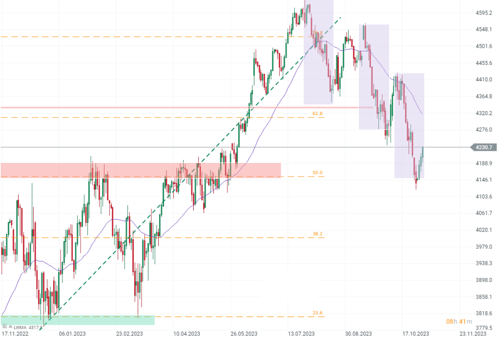 El principal índice estadounidense se está recuperando tras la tercera caída importante. Esto parece similar a los dos intentos de recuperación anteriores y al menos ahora estamos viendo la estructura descendente con movimientos de impulso (baja) mucho más dinámicos. Hay que tener en cuenta que las reacciones al FOMC pueden ser muy volátiles y que la dirección final a veces sólo queda clara al día siguiente.