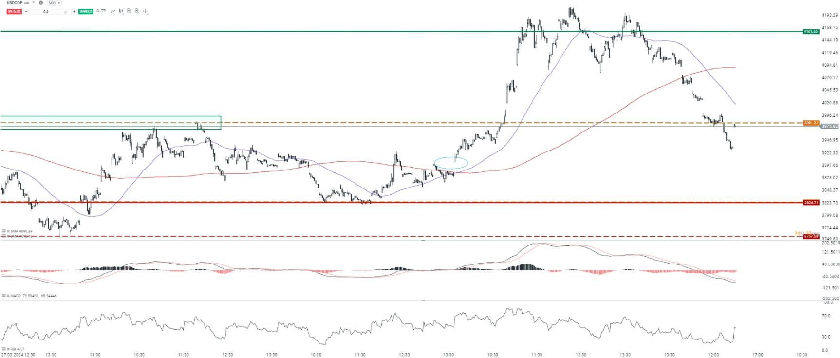 El gráfico de 30 minutos del USDCOP muestra una tendencia alcista que ha encontrado resistencia en el nivel de 4161.65. Posteriormente, el precio ha retrocedido significativamente y está probando soporte en 3975.02. Las medias móviles de corto y largo plazo indican una reciente tendencia bajista con un cruce a la baja. El MACD confirma la presión bajista, mientras que el RSI se encuentra en niveles bajos pero mostrando señales de posible recuperación. El punto clave a observar es el nivel de 3981.31, que podría determinar si el precio retoma la tendencia alcista o continúa la corrección bajista. Fuente: xStation 5