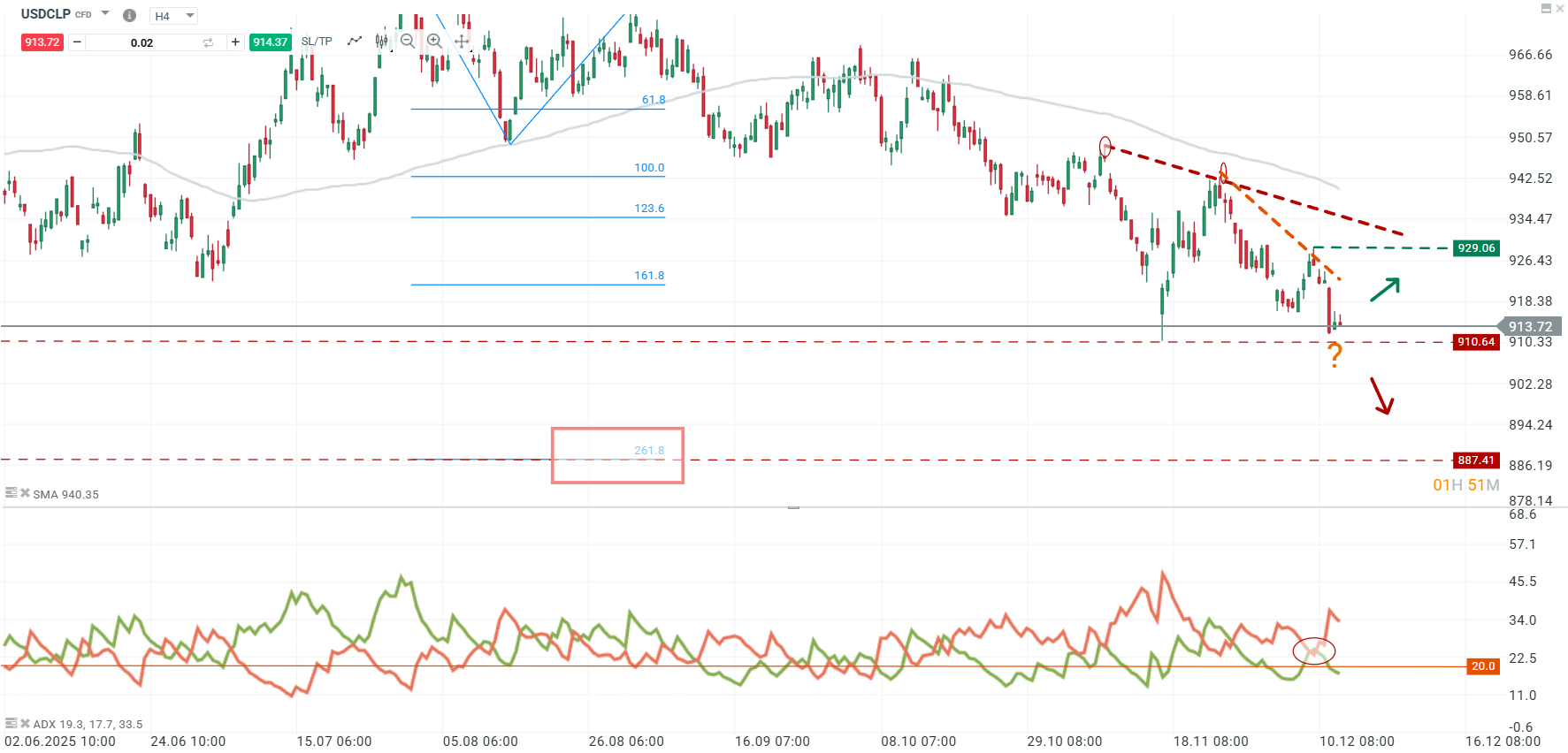Si se pierde con cierre, el siguiente objetivo técnico se ubica en 887, que coincide con la extensión de Fibonacci 261,8%, nivel marcado como soporte mayor.