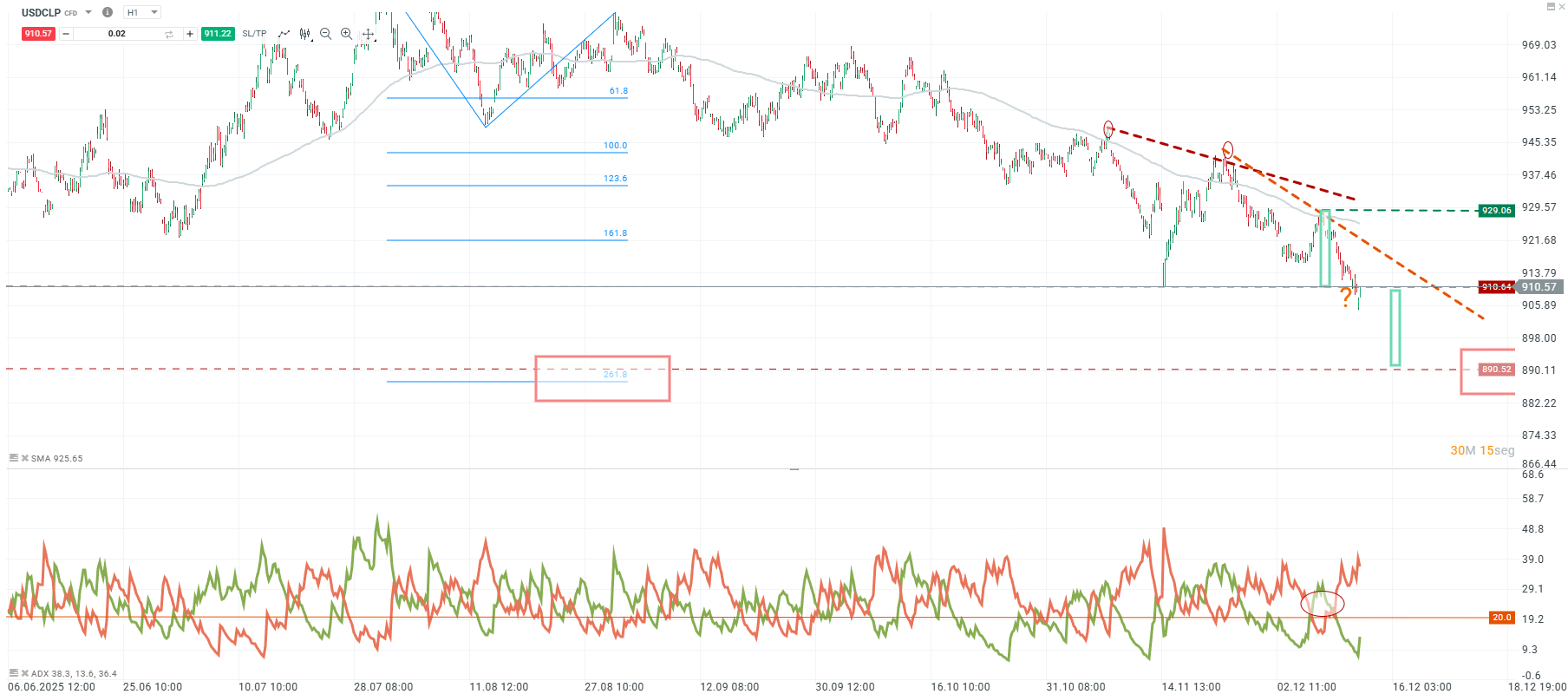 En análisis técnico, el peso chileno se aproxima mucho más hacia la zona de los 900, nivel que actúa como soporte psicológico y referencia clave para el mercado. La mayor volatilidad reciente también abre la puerta a un “aterrizaje” en torno a 890, un nivel psicológico adicional que empieza a tomar protagonismo en la lectura de corto plazo.
