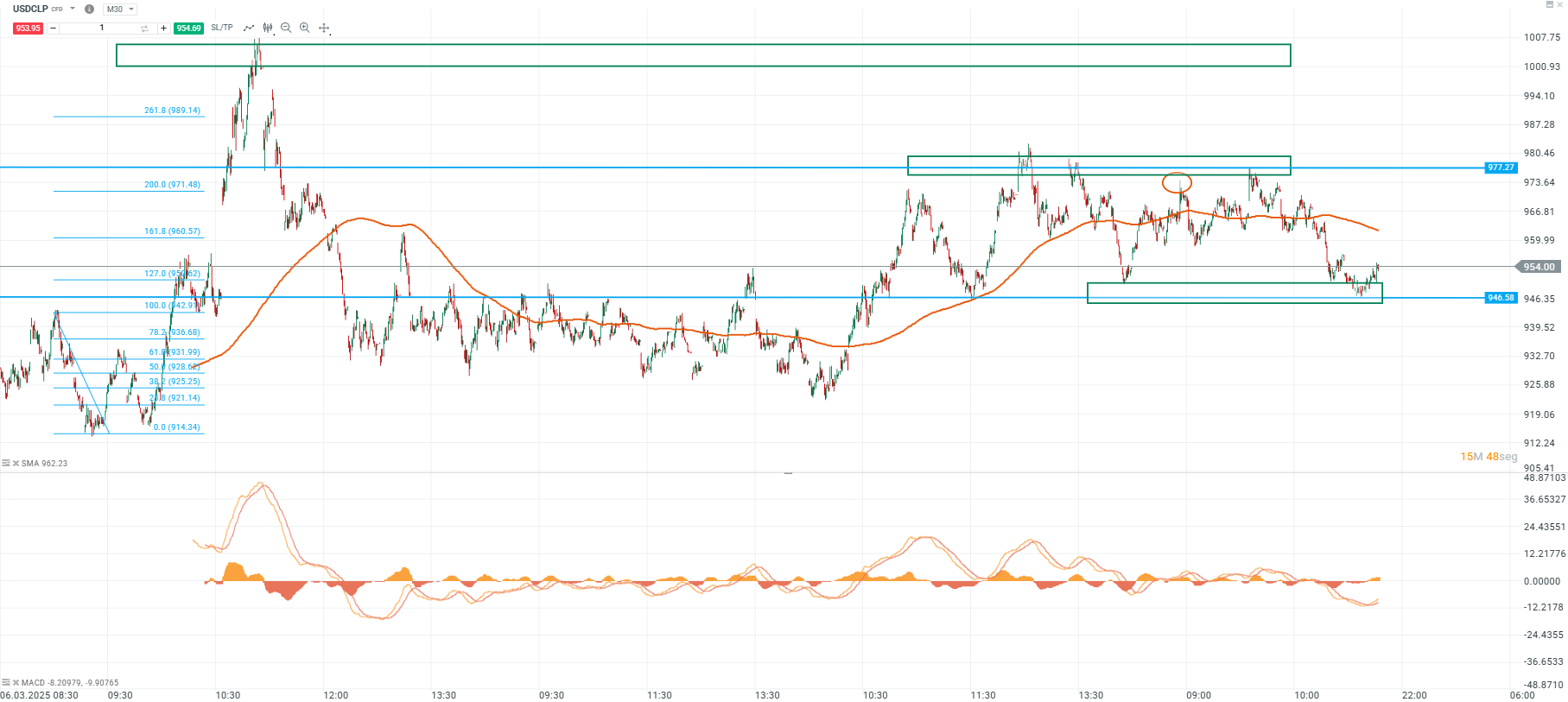 Actualmente, el dólar en Chile cotiza en torno a $954, después de rebotar desde un soporte clave en $946,5, correspondiente al retroceso de Fibonacci del 61,8 % del último impulso alcista.