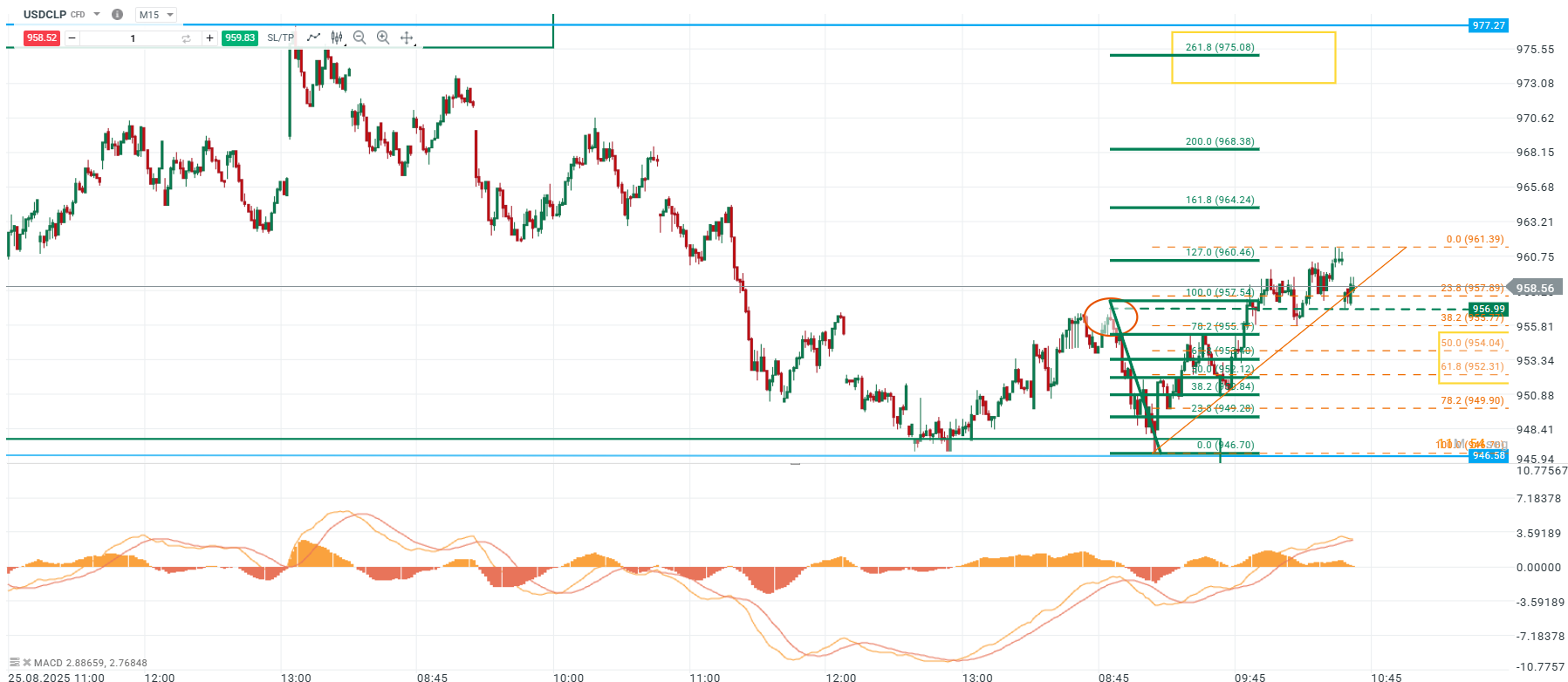 El gráfico de 15 minutos refleja una recuperación del dólar frente al peso chileno tras encontrar piso en la zona de $947–$948, desde donde comenzó un rebote consistente.