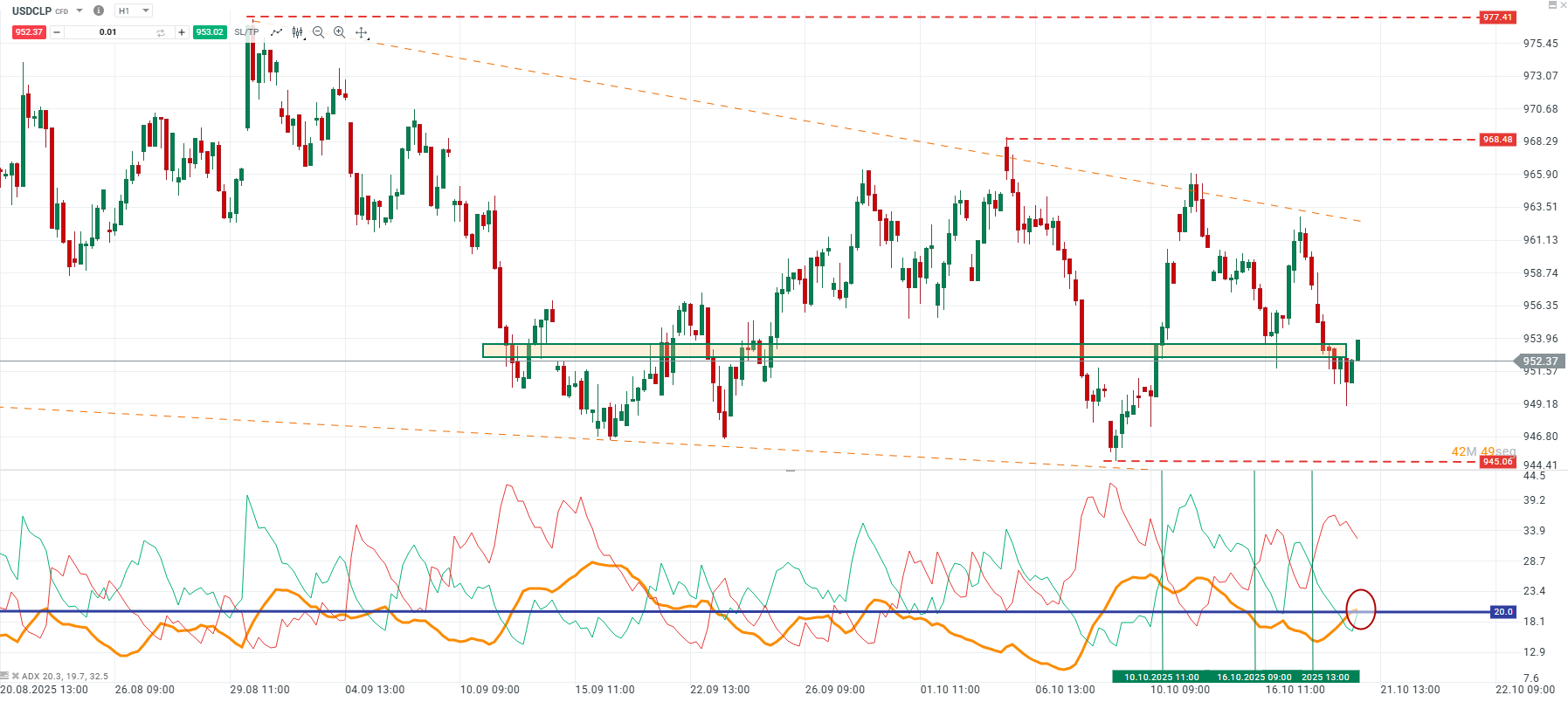El indicador ADX refleja una tendencia débil, con el índice direccional promedio (línea naranja) debajo de 20 y un reciente cruce alcista entre la línea positiva (verde) y la negativa (roja), lo que podría indicar una posible recuperación en el corto plazo si se mantiene el impulso.