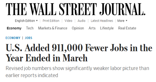 Contrario a lo que sugiere el dato “-911 K” como caída mensual, lo que se publicó hoy es una revisión anual preliminar del empleo. El BLS informó que entre abril de 2024 y marzo de 2025, hubo 911 000 empleos menos de los inicialmente estimados, lo que reduce el promedio mensual de 147 000 a aproximadamente 70 000 empleos generados Reuters+1wsj.com.