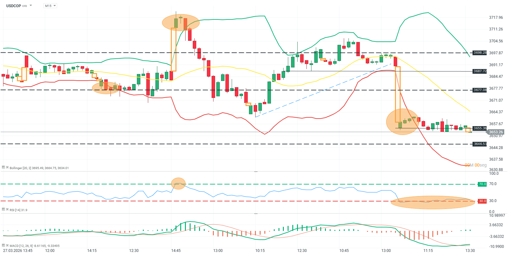 El precio del USDCOP en M15 muestra una ruptura bajista reciente tras una fase de consolidación previa, evidenciada por el desplazamiento desde la zona de 3687 hacia el área de 3655, donde actualmente se observa estabilización. La caída se produce con incremento de volatilidad, reflejado en la apertura de las bandas de Bollinger hacia la parte inferior, y con una clara pérdida de la media móvil, que ahora actúa como referencia dinámica descendente. La estructura de corto plazo pasa a estar dominada por máximos decrecientes, mientras el precio se mantiene presionando una zona de soporte intermedio sin capacidad de recuperación significativa.