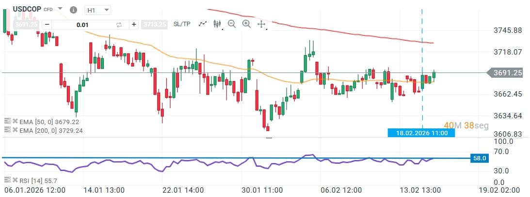Esta fortaleza ha generado debate sobre la rentabilidad de los sectores exportadores tradicionales. El sector cafetero por ejemplo ha visto cómo cada carga pierde entre 500.000 y 550.000 pesos únicamente por el efecto cambiario. El RSI actualmente se sitúa en los 55,7 puntos, lo cual nos señala que aún existe espacio de subida antes de entrar en zona de sobrecompra. Los impulsores de la moneda local siguen siendo la entrada de capital extranjero en deuda pública y el flujo constante de remesas aunque el mercado monitorea de cerca la resistencia de la EMA de 200 periodos en los 3.729,24 pesos.