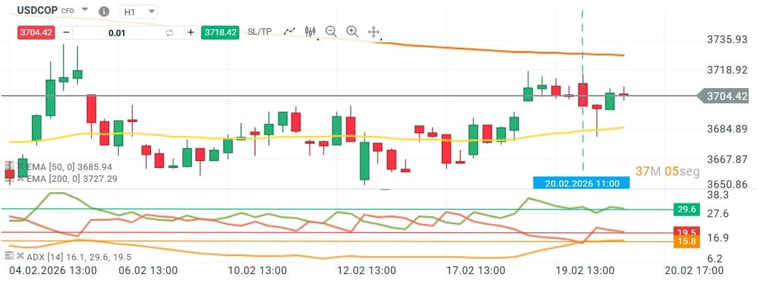 El USDCOP refleja en parte los datos macroeconómicos negativos y la fortaleza del dólar. El precio se sitúa actualmente en 3.704,42, ubicado entre la EMA de 50 periodos (3.685,94), que actúa como soporte dinámico y evita que el retroceso matutino se profundice. No obstante, el avance alcista enfrenta una resistencia débil en la EMA de 200 periodos, situada en 3.727,29, nivel que el par intentó superar sin éxito el 16 de enero y el 5 de febrero.