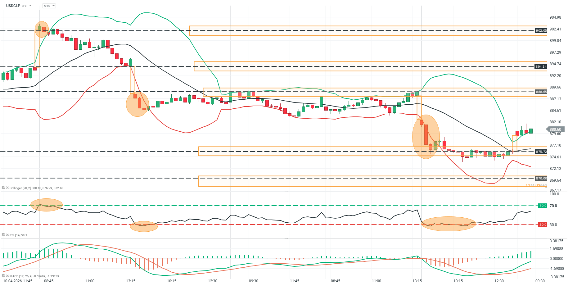 El precio del USDCLP en M15 mantiene una estructura bajista de corto plazo tras la ruptura del rango previo y la aceleración impulsiva que llevó al precio hacia la zona de 875–870, donde aparece una reacción compradora. El rebote actual se desarrolla desde esa zona de soporte, recuperando la media móvil, aunque el precio aún se mantiene dentro de un contexto de máximos descendentes. Las bandas de Bollinger muestran una expansión durante la caída y una posterior contracción, lo que sugiere fase de consolidación tras el impulso bajista.