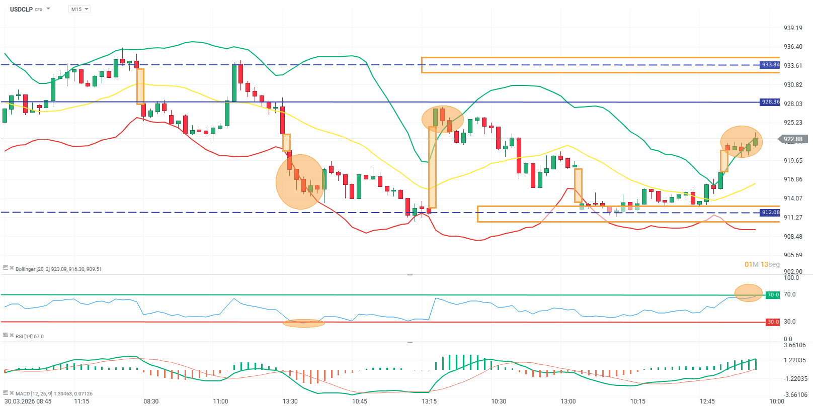 En USDCLP en M15 se observa una estructura de recuperación tras una fase bajista previa, donde el precio rebota con fuerza desde la zona de 912.08 (soporte marcado) luego de un tramo descendente sostenido. Este movimiento alcista se desarrolla con recuperación de la media móvil (línea amarilla), que comienza a girar al alza, y con el precio desplazándose hacia la zona de 922.88, donde actualmente se encuentra testeando una resistencia intermedia. Las bandas de Bollinger muestran expansión tras el impulso alcista reciente, lo que refleja aumento de volatilidad en este movimiento, luego de una fase previa de contracción. A nivel estructural, la zona de 928.36 se mantiene como resistencia superior relevante, mientras que 933.84 continúa siendo el techo más amplio del rango.