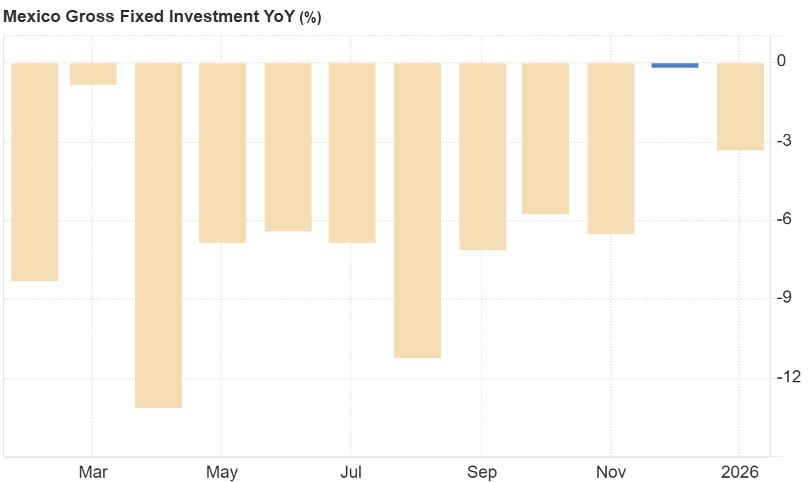 El dato más relevante de la jornada es la inversión fija bruta de enero, que registró una caída de -3,30% anual, muy por debajo del -2,10% esperado, mientras que en términos mensuales retrocedió -1,10%, también peor que el -0,80% proyectado. Este resultado confirma la debilidad económica y además la amplifica, porque se trata del componente más importante para determinar la capacidad productiva futura de la economía.