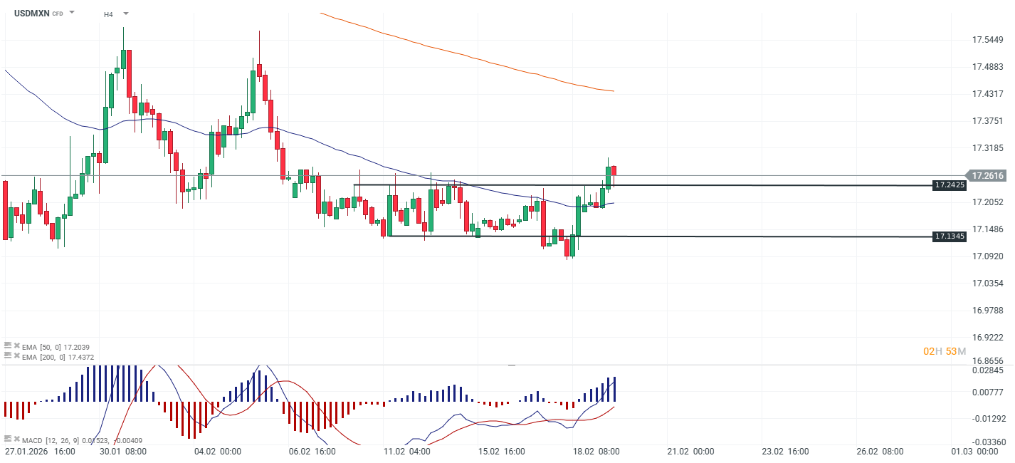 En el gráfico de 4 horas, el par USDMXN muestra claras señales de recuperación al romper al alza una zona de consolidación lateral, superando la resistencia clave ubicada en 17.2425 tras haber defendido y rebotado desde el soporte estructural de 17.1345. Este impulso alcista de corto plazo se ve respaldado por la acción del precio cruzando por encima de la EMA de 50 periodos, mientras que el oscilador MACD confirma el cambio de momentum con un cruce ascendente de sus líneas y un histograma en fuerte expansión sobre el nivel cero.