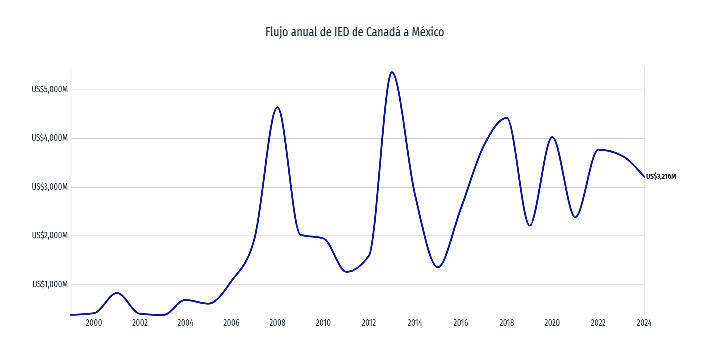 En el periodo Enero a Diciembre 2024, la IED proveniente de Canadá a México alcanzó los US$2,595M, distribuidos en reinversión de utilidades (US$1,756M), cuentas entre compañías (US$636M) y nuevas inversiones (US$204M). Fuente: economia.gob.mx.