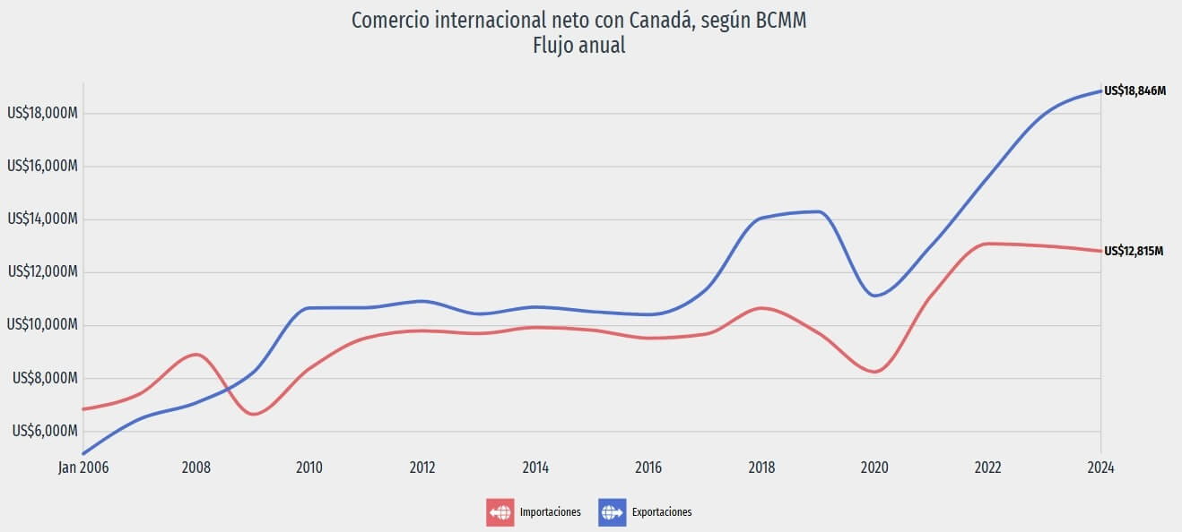 En noviembre de 2025, las exportaciones de México a Canadá fueron US$1,882M, mientras que las importaciones alcanzaron US$962M. Lo anterior resulta en un balance comercial de US$920M. Fuente: economia.gob.mx.