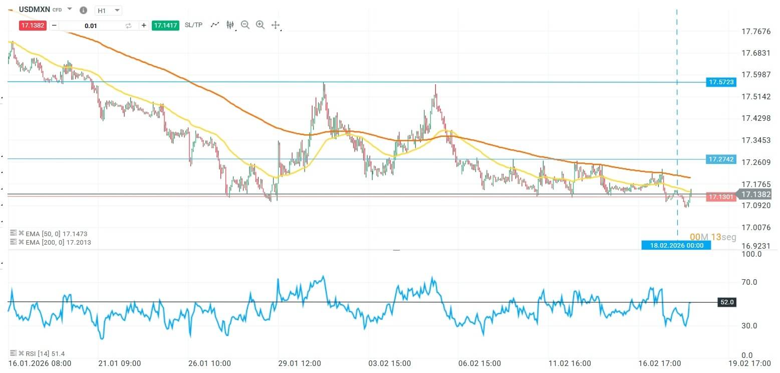 El USDMXN está testeando el nivel de soporte de 17.1301 y en caso de romper a la baja el peso mexicano podría buscar su mínimo anual en la zona de las 17.09 unidades. Por el lado de las resistencias la media móvil exponencial de 50 periodos en los 17.1473 funciona como el primer techo relevante mientras que la resistencia histórica en los 17.5723 marca la frontera clave de reversión de la tendencia bajista de corto plazo.