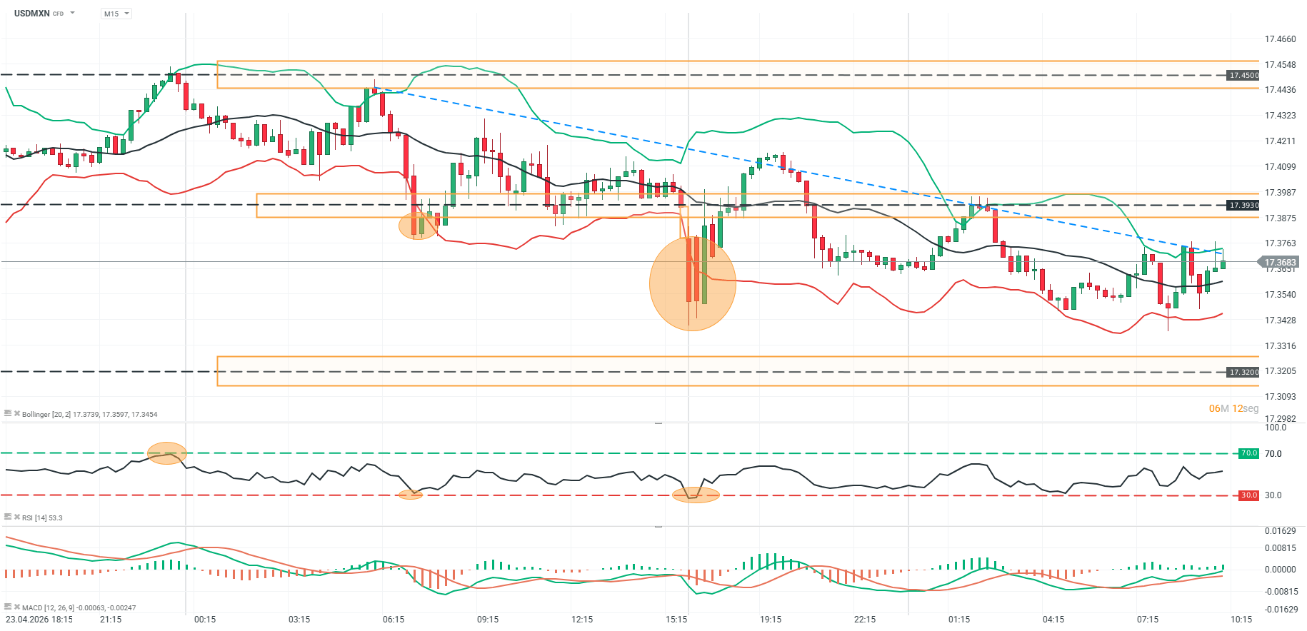 En el corto plazo, la acción del precio muestra compresión entre 17.35 y 17.39, con cuerpos pequeños y alternancia de velas que reflejan indecisión. El RSI se mantiene en niveles medios sin sobrecompra ni sobreventa, mientras el MACD empieza a girar levemente al alza, sugiriendo una posible pérdida de momentum bajista. Un quiebre sostenido por encima de 17.39–17.40 podría habilitar un rebote hacia la directriz descendente, mientras que una pérdida clara de 17.35 aumentaría el riesgo de una extensión bajista hacia 17.32.