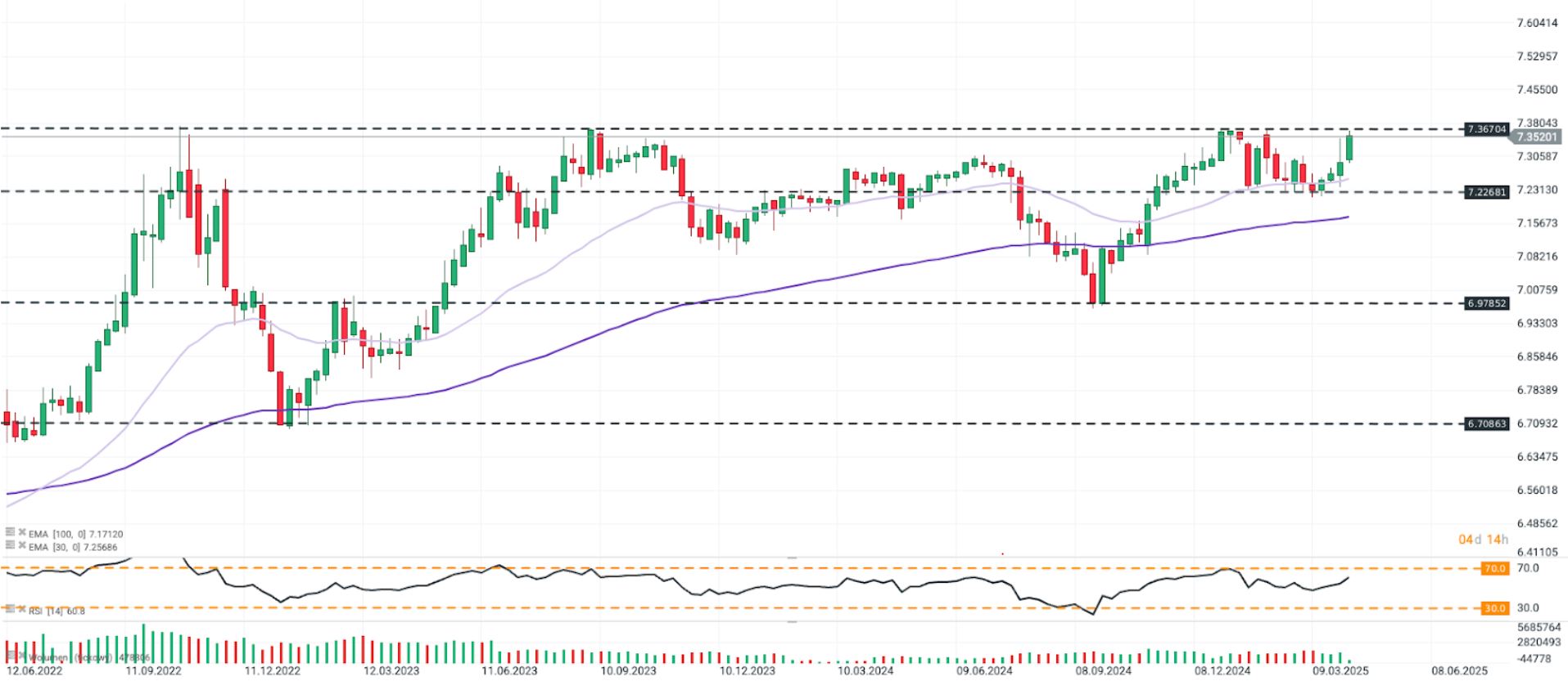 El yuan chino regresa hoy a un mínimo histórico después de que el Banco Popular de China (PBOC) debilitó el tipo de cambio de referencia frente al dólar a 7,2038 CNH. El tipo de cambio superó el nivel psicológico de 7,20 por primera vez desde la elección de Donald Trump en noviembre y se encuentra ahora en su nivel más bajo desde septiembre de 2023.