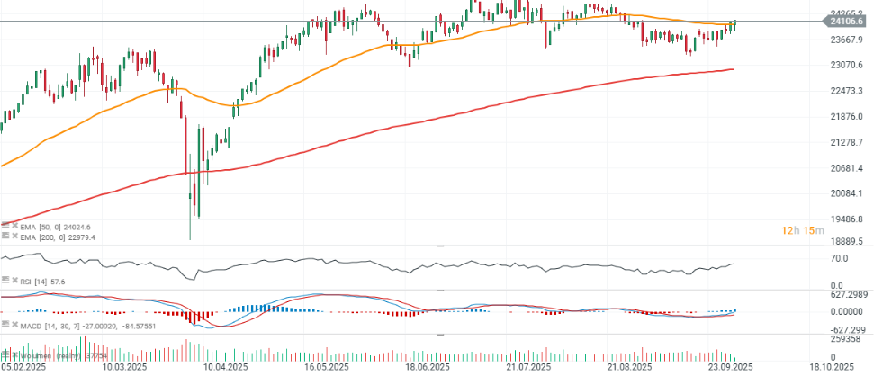 El Dax 40 se sitúa por encima de la EMA50 (línea naranja), cotizando a sus niveles más altos desde el 2 de septiembre de 2025. El cierre del gobierno estadounidense no ha afectado significativamente el sentimiento del mercado global.