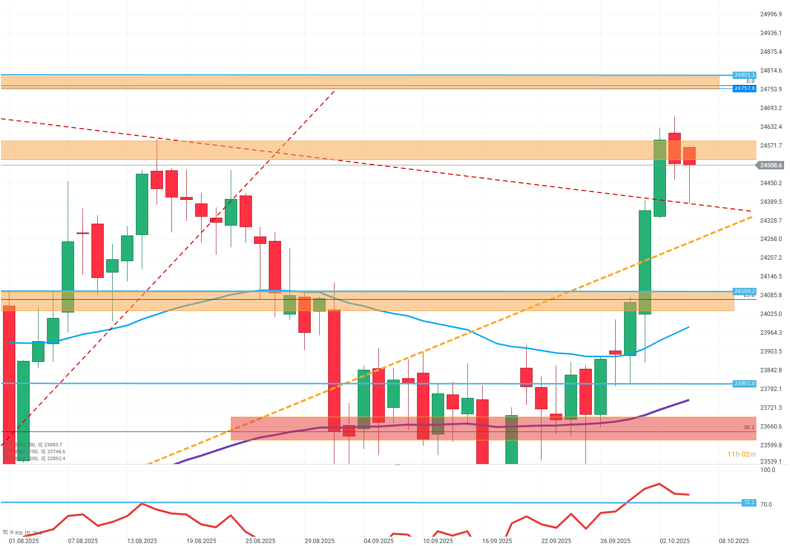 El Dax se mantuvo por debajo del nivel de resistencia de 24.600 a 24.500, lo que indica debilidad de los compradores. Considerando el alto indicador RSI, el escenario base podría ser una corrección bajista hacia el soporte en FIBO 23. Sin embargo, si los compradores logran superar la resistencia más cercana y mantienen el impulso alcista, el próximo objetivo sería otro máximo histórico.