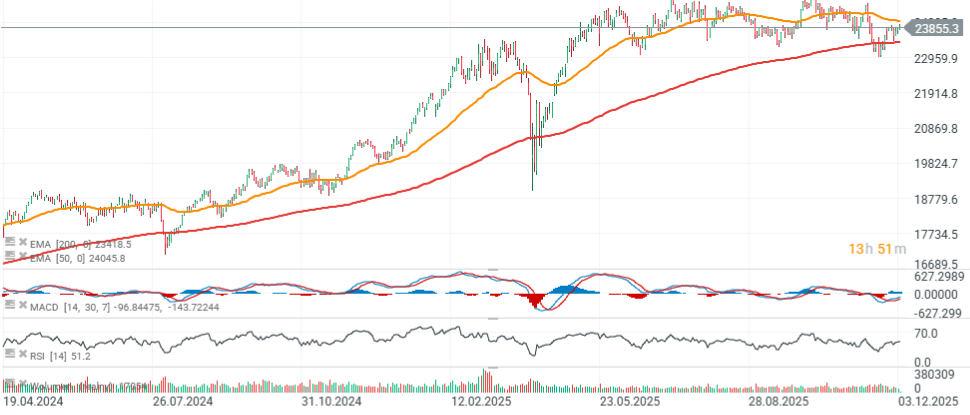 El Dax 40 cotiza entre las medias móviles de 200 días (línea roja) y 50 días (línea naranja). Las últimas sesiones tienen sesgo alcista, en línea con el repunte de Wall Street.