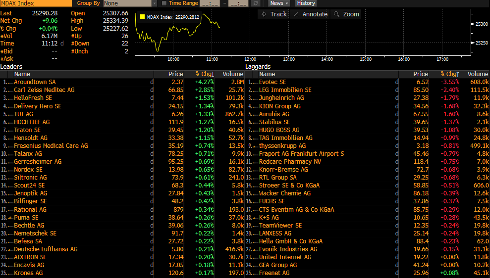 Entre las empresas, Aroundtown y Carl Zeiss Meditec están ganando terreno en el índice alemán de mediana capitalización (MDAX), mientras que KION, Evotec y Aurubis están perdiendo. Fuente: Bloomberg Finance L.P.