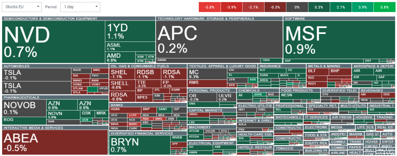 En el mercado europeo, las acciones de las empresas de materias primas, de los productores de petróleo y de los bancos británicos son las que más pierden hoy. En el sector automovilístico alemán se registran ligeras caídas. Fuente: xStation5