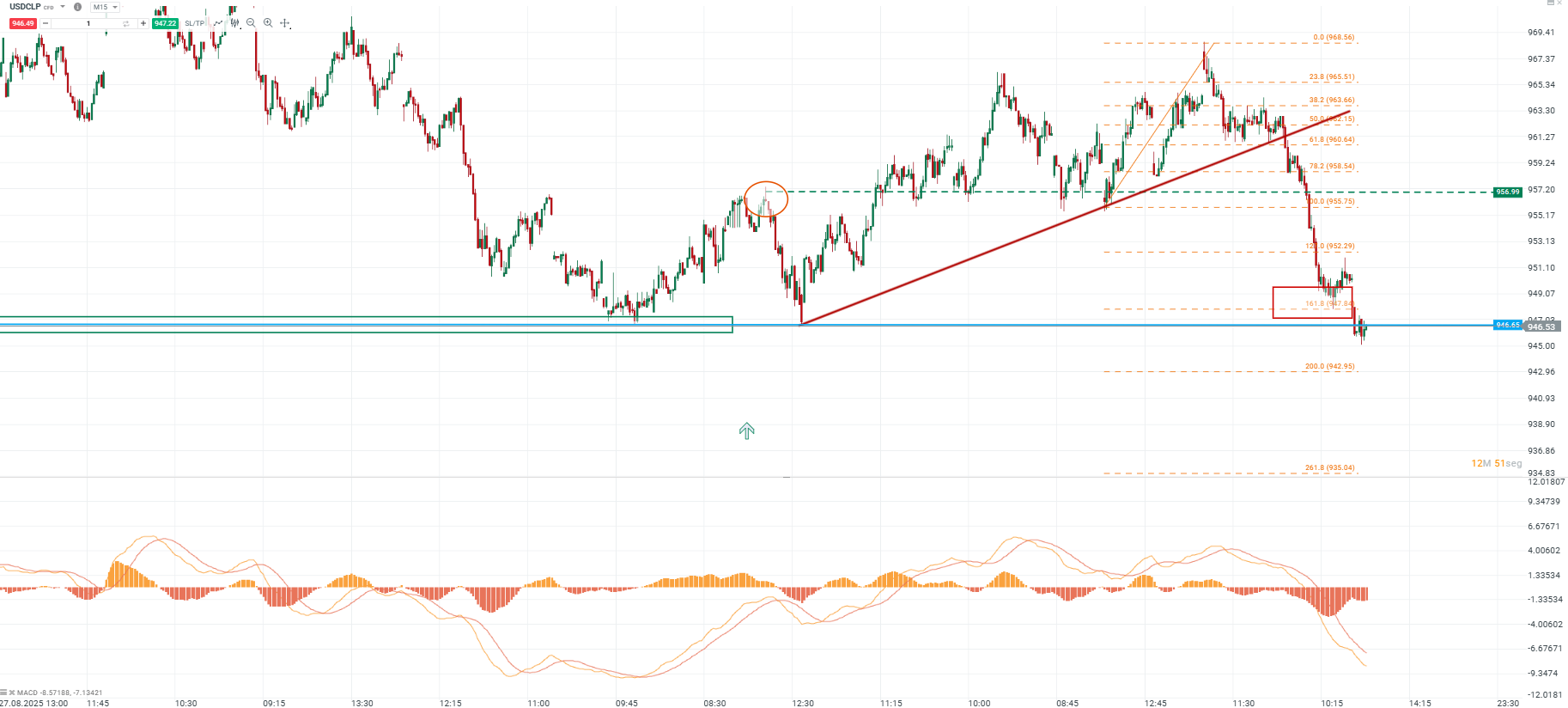 Resistencia inmediata: entre 952–955 pesos, correspondiente al retroceso de Fibonacci 121.8% y a un antiguo nivel de congestión.