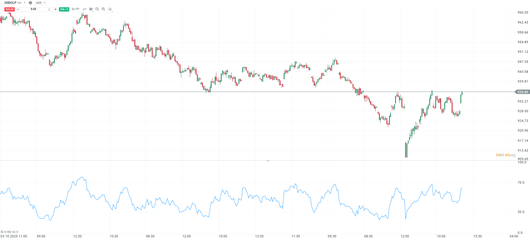 Análisis técnico breve del dólar en Chile (M30)