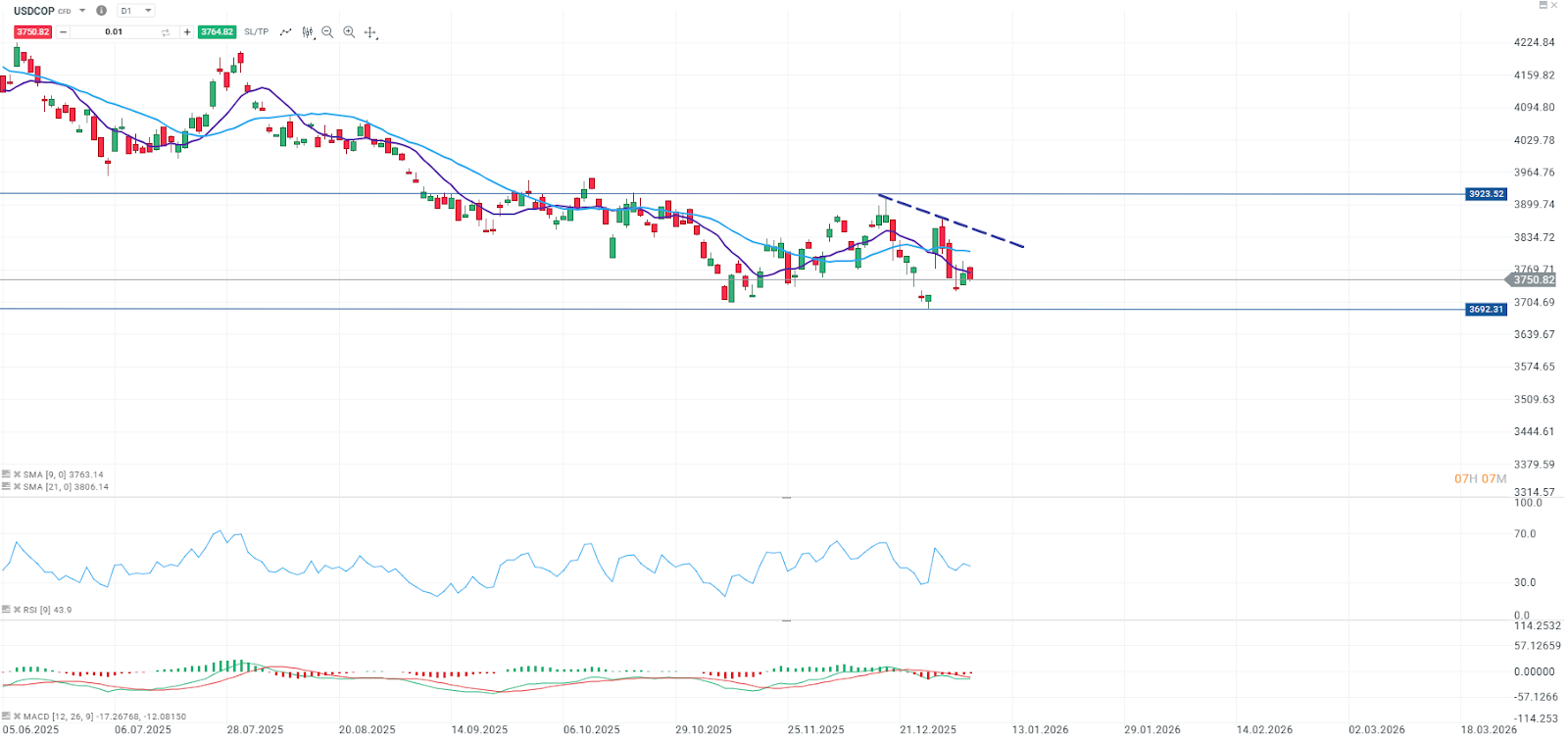 Desde el punto de vista técnico, la referencia principal se mantiene en la zona de 3.692. Este nivel sigue actuando como soporte estructural para el par USDCOP.