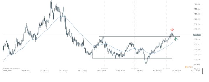 Por otro lado, dentro del índice podemos observar señales mixtas acerca de lo que podemos anticipar respecto del dólar estadounidense. El precio ha vuelto a probar el límite superior del rango previamente superado y actualmente se encuentra en una zona crítica para determinar el próximo gran movimiento del dólar frente a las principales divisas.