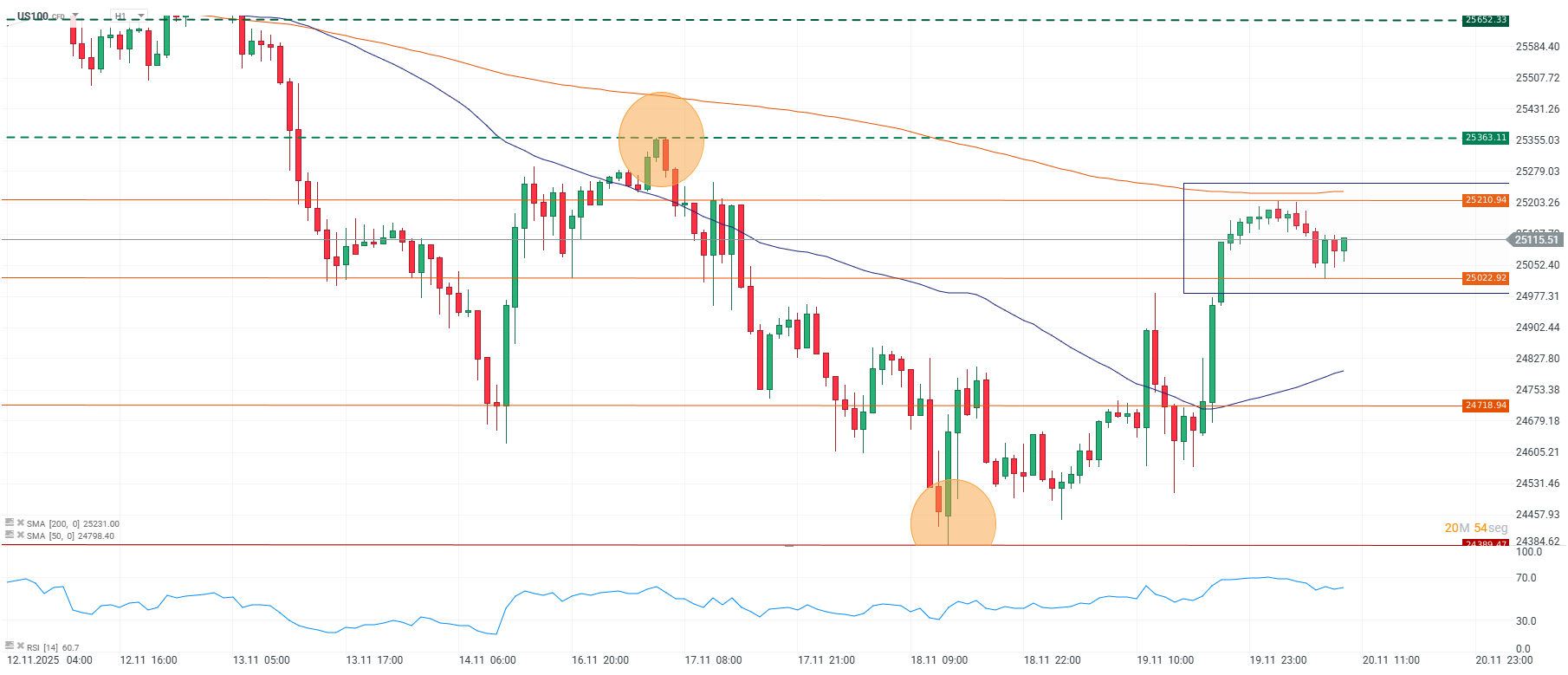El Nasdaq llega al informe después de un rebote que encontró techo en la zona de 25.210, resistencia que coincide con la EMA 200 en temporalidad H1. La estructura reciente muestra una recuperación desde los mínimos de 24.389, pero sin lograr romper la barrera superior. El precio se mueve dentro de un recuadro lateral entre 25.210 y 25.020, formando una pausa típica previa a un evento macro.