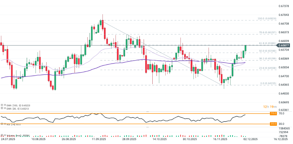 El par forex AUD/USD continúa su repunte, sumando otro 0,3% ante la debilidad generalizada del dólar y el nuevo dato del PIB de Australia. Las lecturas fueron inferiores a lo esperado, pero subrayaron las crecientes presiones inflacionarias, lo que refuerza las expectativas del mercado por una postura restrictiva del RBA.