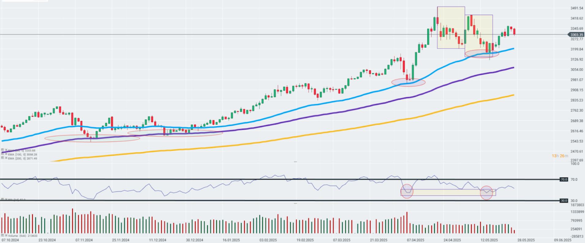 El impulso alcista del oro se está desvaneciendo, aunque la tendencia alcista de largo plazo aún no se ha roto. Desde una perspectiva técnica, la media móvil exponencial de 50 días (línea azul en el gráfico) sigue siendo un soporte importante, tras haber frenado la caída de precios en dos ocasiones, el 7 de abril y el 15 de mayo. La resistencia técnica es el pico de la sesión del 23 de mayo y el doble pico en la zona de máximos históricos.