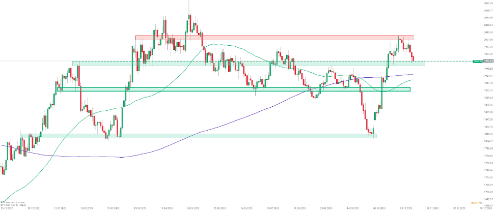 Al observar el gráfico de ORO en el intervalo D1, podemos ver que el precio se acerca a la zona de soporte de $ 1.960 por onza, marcada con reacciones de precios anteriores. Una ruptura por debajo de esta área puede presagiar una prueba de las dos medias móviles importantes: la media móvil de 200 sesiones (línea morada, zona de 1.935 dólares) y la media móvil de 50 sesiones (línea verde, zona de 1.923 dólares).