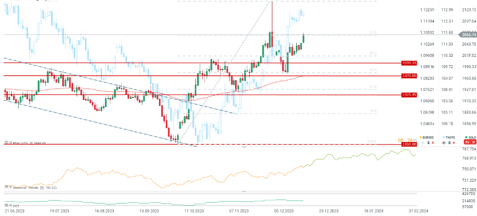 Esto proporciona el potencial para el cierre histórico más alto en el mercado del oro. Anteriormente, el oro cerró en su nivel más alto el 30 de noviembre a un precio de 2.070,75 dólares la onza. Posteriormente, el 4 de diciembre vimos un repunte hasta casi 2.150 dólares, pero finalmente el oro cerró por debajo de 2.030 dólares. En estos momentos, el oro ha retrocedido ligeramente por debajo de los 2.070 dólares, pero con el inicio de la sesión en Wall Street en EE.UU. no se puede excluir un incremento de la volatilidad.