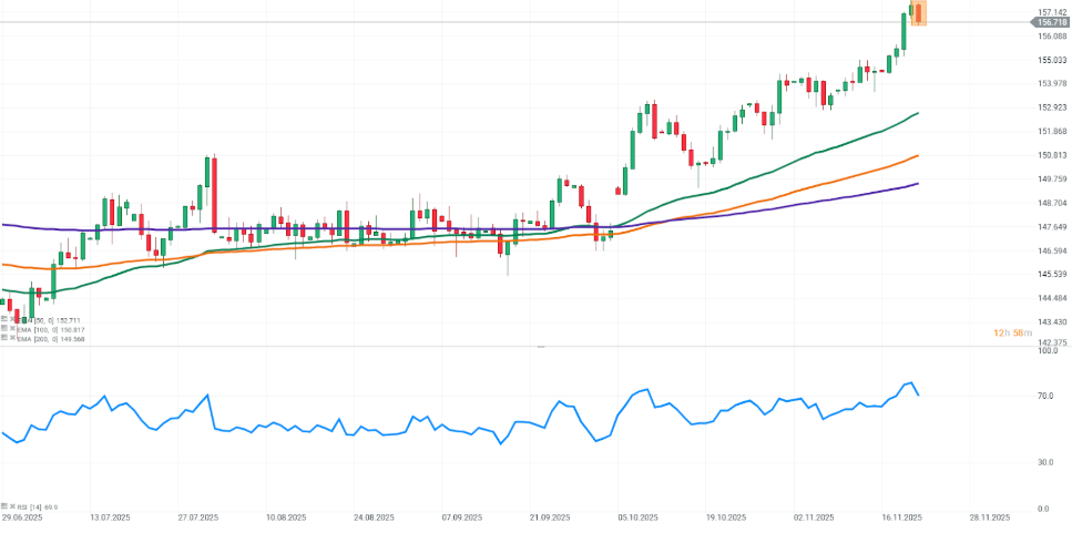 El tipo de cambio USD/JPY se sitúa en el cruce de 156,7. La sesión de hoy está influenciada por una compleja combinación de factores fundamentales, donde la fortaleza del dólar compite con posibles intervenciones de Japón. La diferencia en política monetaria entre EE. UU. y Japón sigue favoreciendo al dólar, pero el riesgo de medidas por parte del Banco de Japón y el gobierno japonés limita el potencial alcista del par. La atención se centra en los datos económicos estadounidenses, las actas de la Fed y el paquete fiscal de 21,3 billones de yenes recientemente aprobado por Japón.