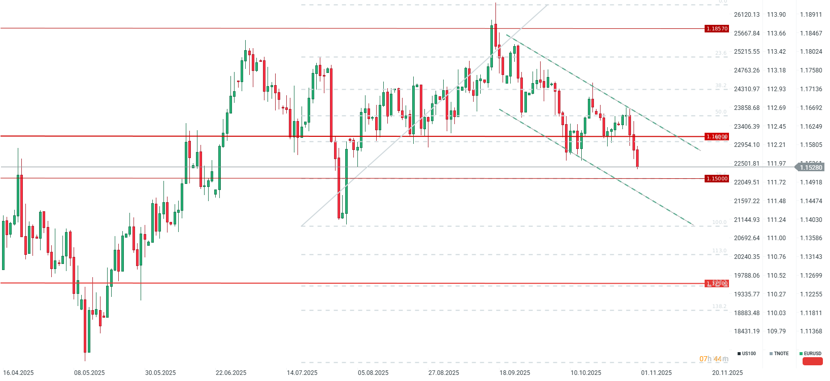 El par EUR/USD cae hoy por debajo del nivel de 1,1530, rompiendo el soporte de mediados de mes. Hace apenas tres sesiones, el par se encontraba más cerca del nivel de 1,17, pero actualmente parece que el nivel de 1,1500 está a su alcance. Fuente: xStation5