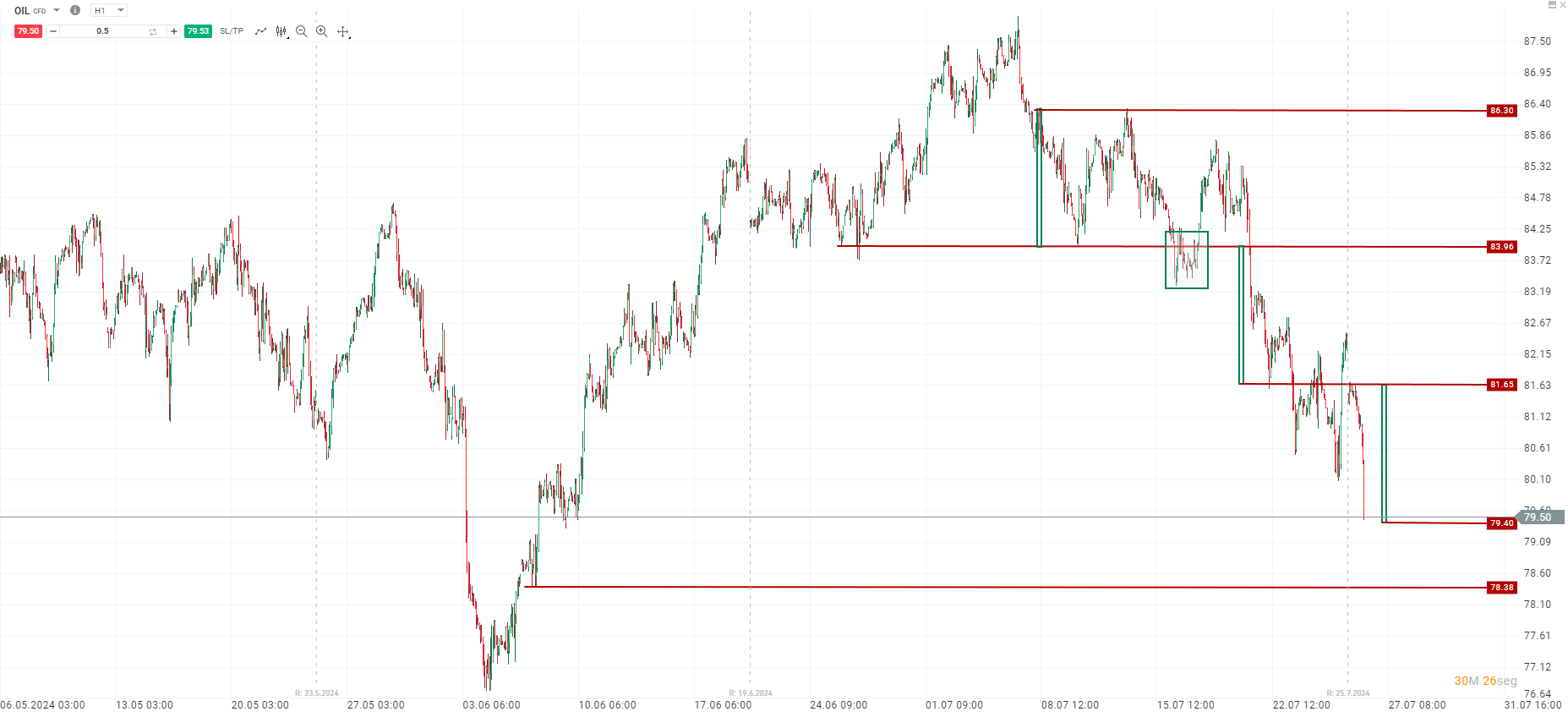 Escenario bajista: En caso de una ruptura del nivel de soporte en 79.40, el precio podría dirigirse hacia el siguiente nivel de soporte en 78.38. Una ruptura por debajo de este nivel indicaría una continuación bajista más pronunciada.