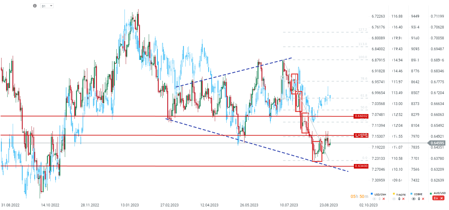 El AUD/USD ha roto la tendencia bajista pero encontró resistencia alrededor del nivel 0.65, donde también reside el retroceso del 23.6% de la última onda descendente. El cobre indica niveles potencialmente más altos para el AUD, pero al mismo tiempo, ha aparecido una señal bajista en el cobre. El yuan ha ganado recientemente, pero sigue siendo débil y no da una señal fuerte para el AUD. En el mejor de los casos, se podría esperar una reevaluación del nivel 0.65 si la declaración del RBA es más agresiva que antes. Fuente: xStation5