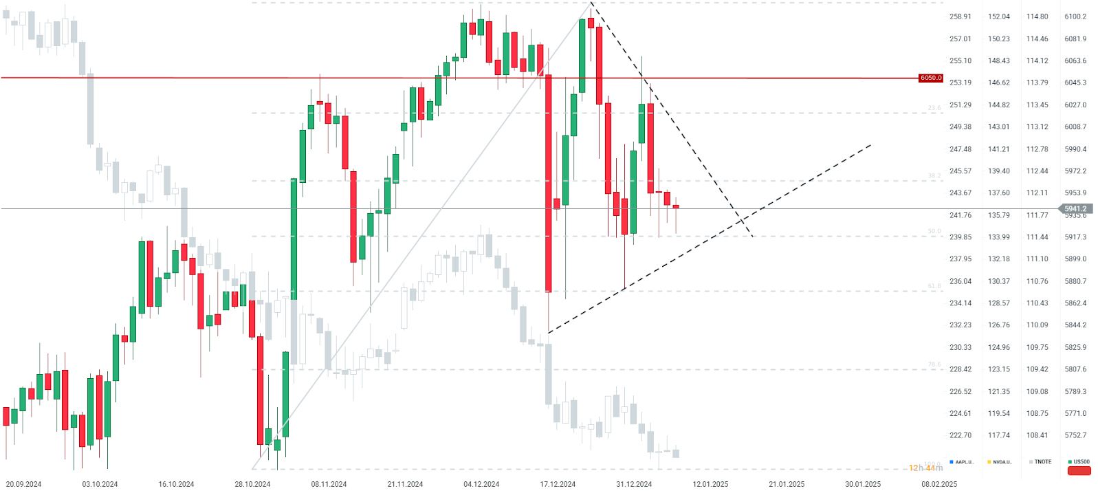 Por lo tanto, unos débiles datos de las NFPs probablemente desencadenaría una venta masiva inicial en el S&P 500. Sin embargo, es poco probable que caiga por debajo de los 5.900 puntos hoy, ya que la línea de tendencia ascendente, que también forma el límite inferior de un patrón de triángulo, debería brindar soporte. La acción reciente del precio sugiere interés de compra por encima de 5.900, lo que podría empujar al S&P 500 a probar el rango de 5.960-5.975 en el corto plazo.