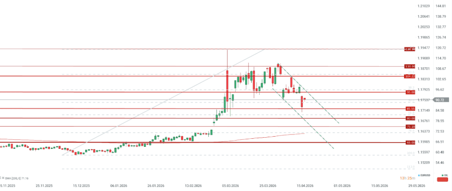 El precio del Brent abre al alza, pero al mismo tiempo no parece que el mercado de futuros esté especialmente preocupado por la escalada. Con el cierre renovado del Estrecho de Ormuz, los precios deberían superar el nivel de 100 USD por barril. Actualmente, la resistencia clave parece ser la zona de 95 USD por barril, en el retroceso del 38,2% y el límite superior del canal bajista.