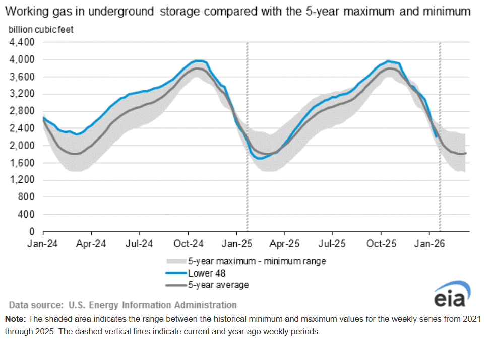 La sensación general de exceso de oferta en EE. UU., a pesar de las recientes caídas en inventarios (-249 Bcf en la semana hasta el 6 de febrero), sigue ejerciendo presión bajista, especialmente con el aumento de la producción de shale. Los inventarios siguen siendo abundantes, aunque han caído por debajo del promedio de 5 años (pero al final de la temporada de calefacción), lo que limita las subidas incluso si cambian las previsiones meteorológicas. A largo plazo, la demanda europea de GNL podría impulsar los precios, pero en el corto plazo predomina el clima cálido. El mercado está a la espera de posibles errores en las previsiones de la NOAA que puedan revertir la tendencia.