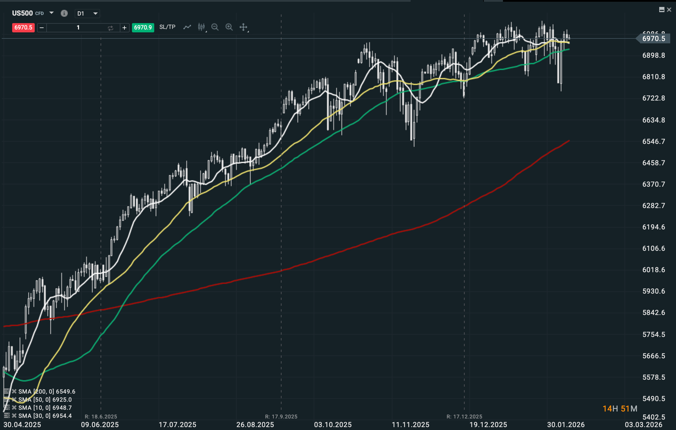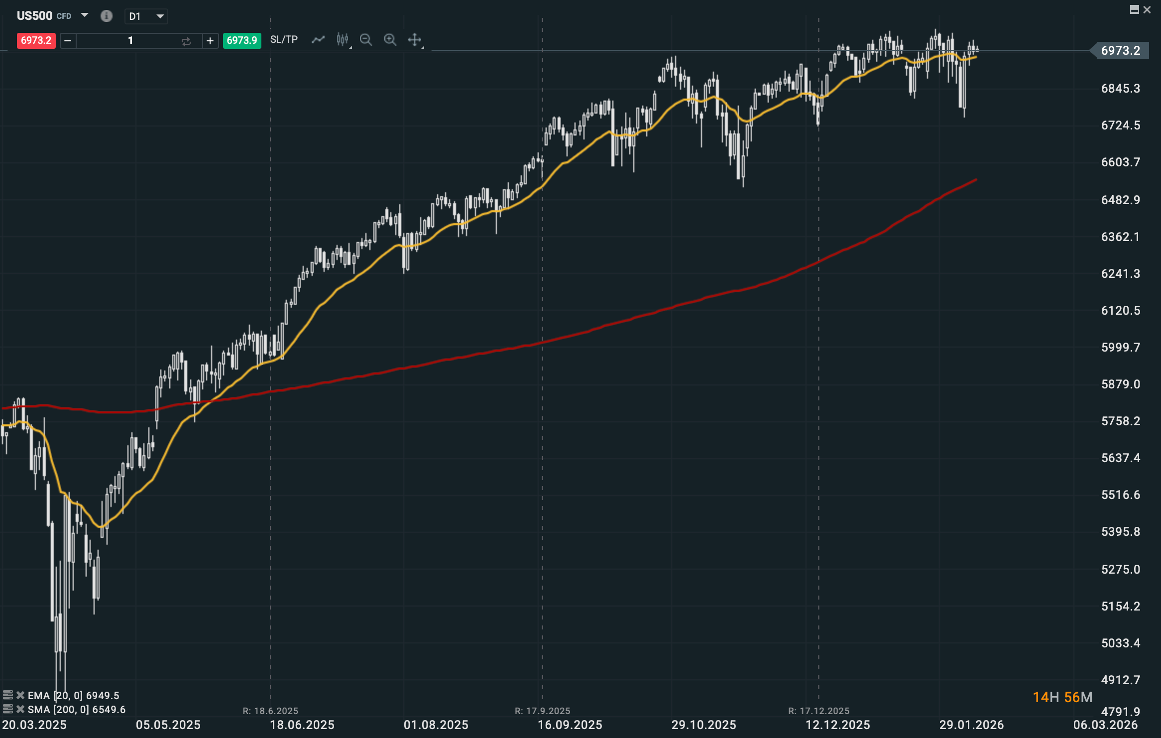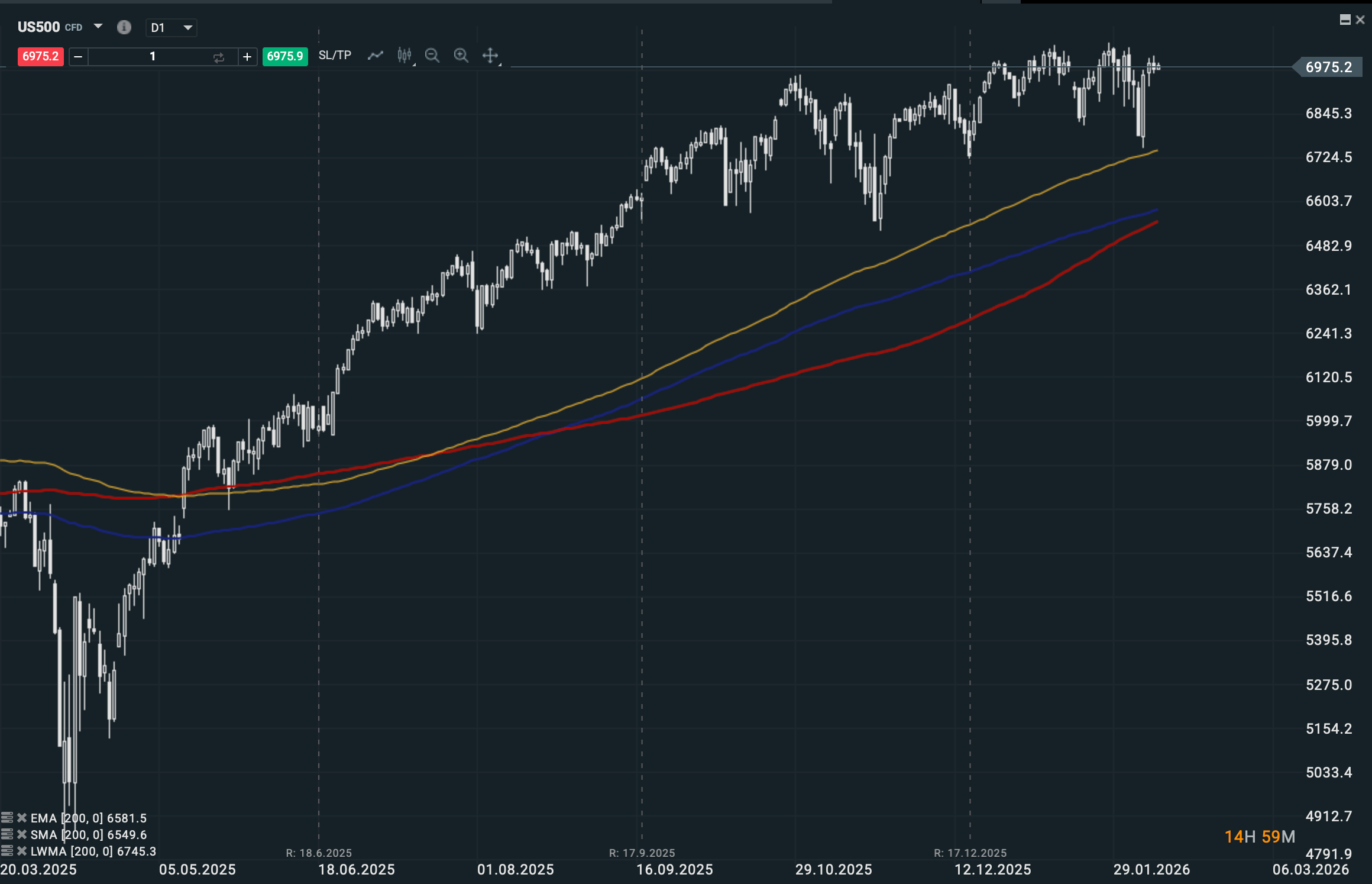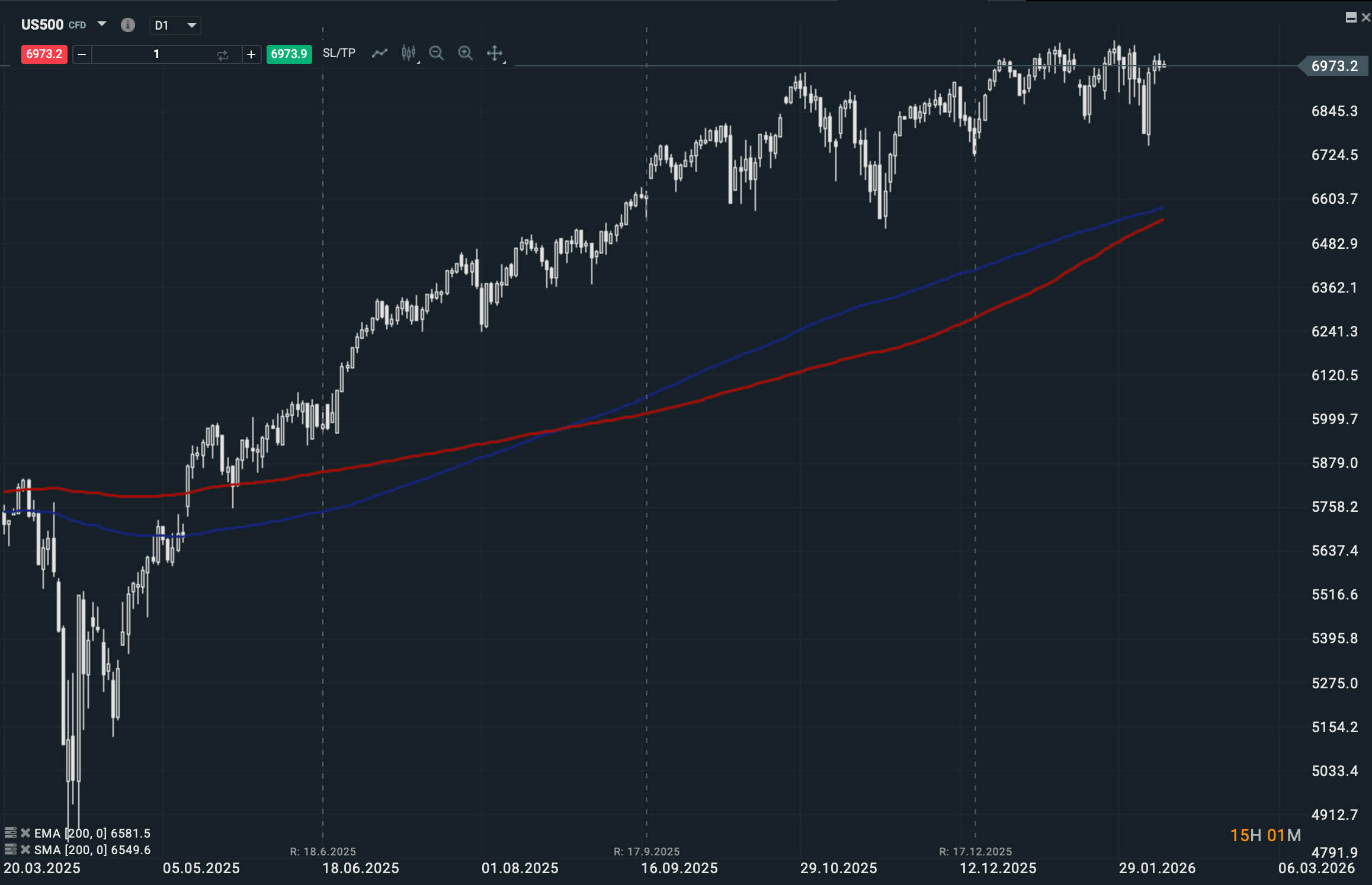 Media móvil simple de 200 (SMA) en rojo vs Media móvil exponencial de 20 (EMA) en amarillo. Fuente: xStation5