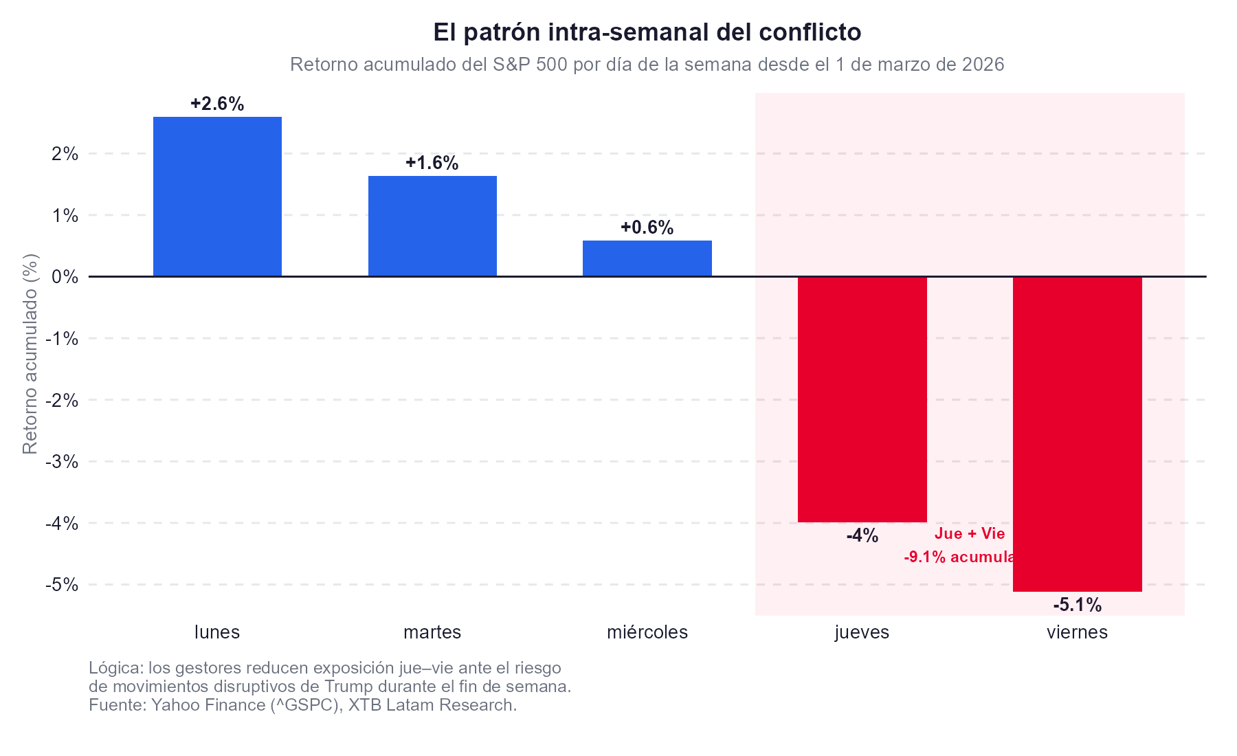 El comportamiento del mercado durante las cinco semanas de conflicto ha establecido un patrón predecible que los gestores ya tienen identificado. El índice arranca la semana al alza impulsado por titulares de negociación, deriva hacia el martes y el miércoles, y colapsa el jueves y el viernes cuando los inversores reducen exposición antes del fin de semana. Desde el inicio de la guerra, el índice acumula ganancias en los primeros tres días de cada semana pero cede un 9% neto en los jueves y viernes. La lógica es que el fin de semana representa un período de inactividad de mercado de dos o tres días durante el cual Trump históricamente lanza sus movimientos más disruptivos, y mantener posiciones abiertas durante ese período es asumir riesgo que muchos gestores no están dispuestos a correr.