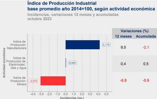 El Índice de Producción Manufacturera (IPMan) de octubre mostró un crecimiento mensual y anual. Varias industrias contribuyeron a este aumento, incluyendo la fabricación de sustancias y productos químicos, maquinaria y equipo, y la elaboración de productos alimenticios. Sin embargo, la fabricación de otros productos minerales no metálicos experimentó una disminución.