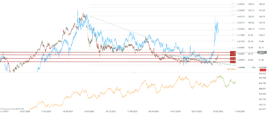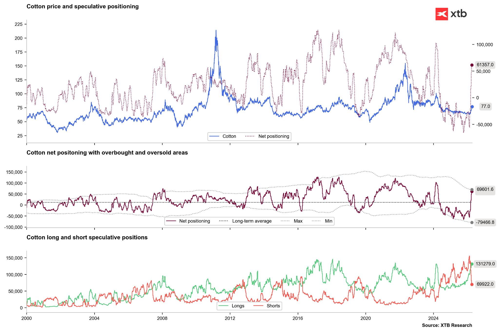 El fuerte movimiento del precio está relacionado con el short‑covering. Las grandes posiciones cortas mantenidas por fondos se vieron obligadas a cerrarse después de que el mercado encontrara un suelo cerca de los 60 centavos. Además, las perspectivas de importaciones de algodón por parte de China han mejorado, como confirman los datos de exportación de EE. UU.