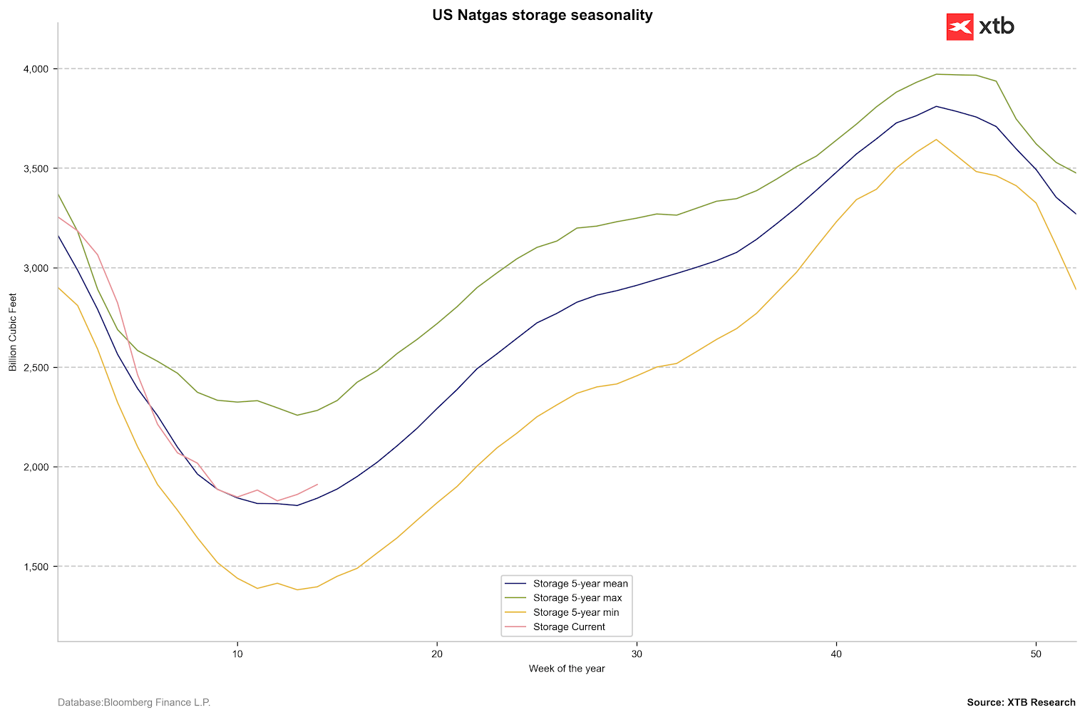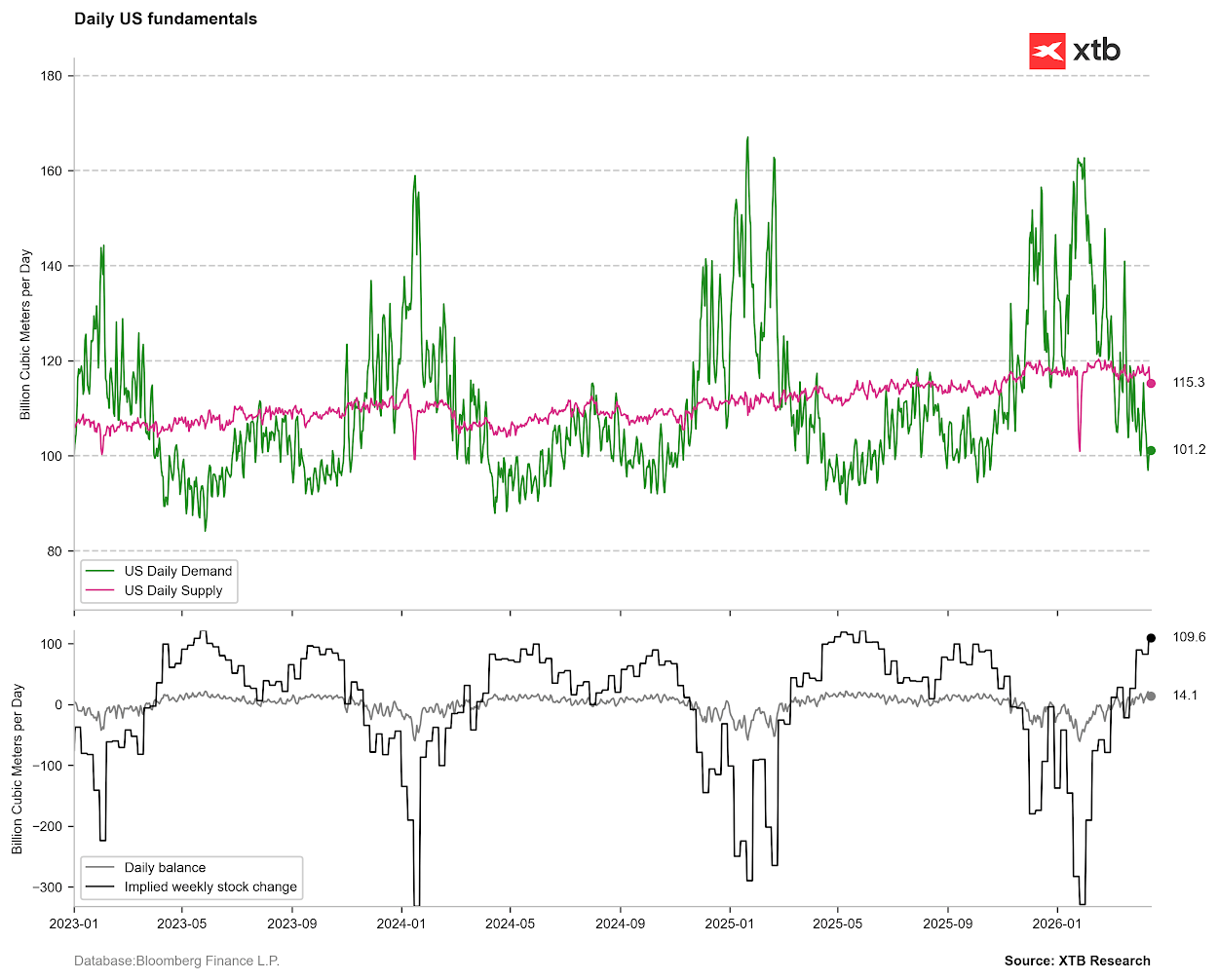 El cambio implícito en los inventarios de EE. UU. supera actualmente los 100 bcf, un fenómeno poco habitual en esta época del año. Fuente: Bloomberg Finance LP, XTB