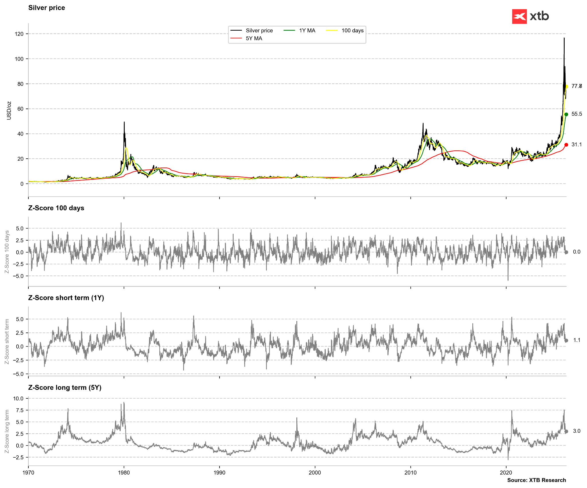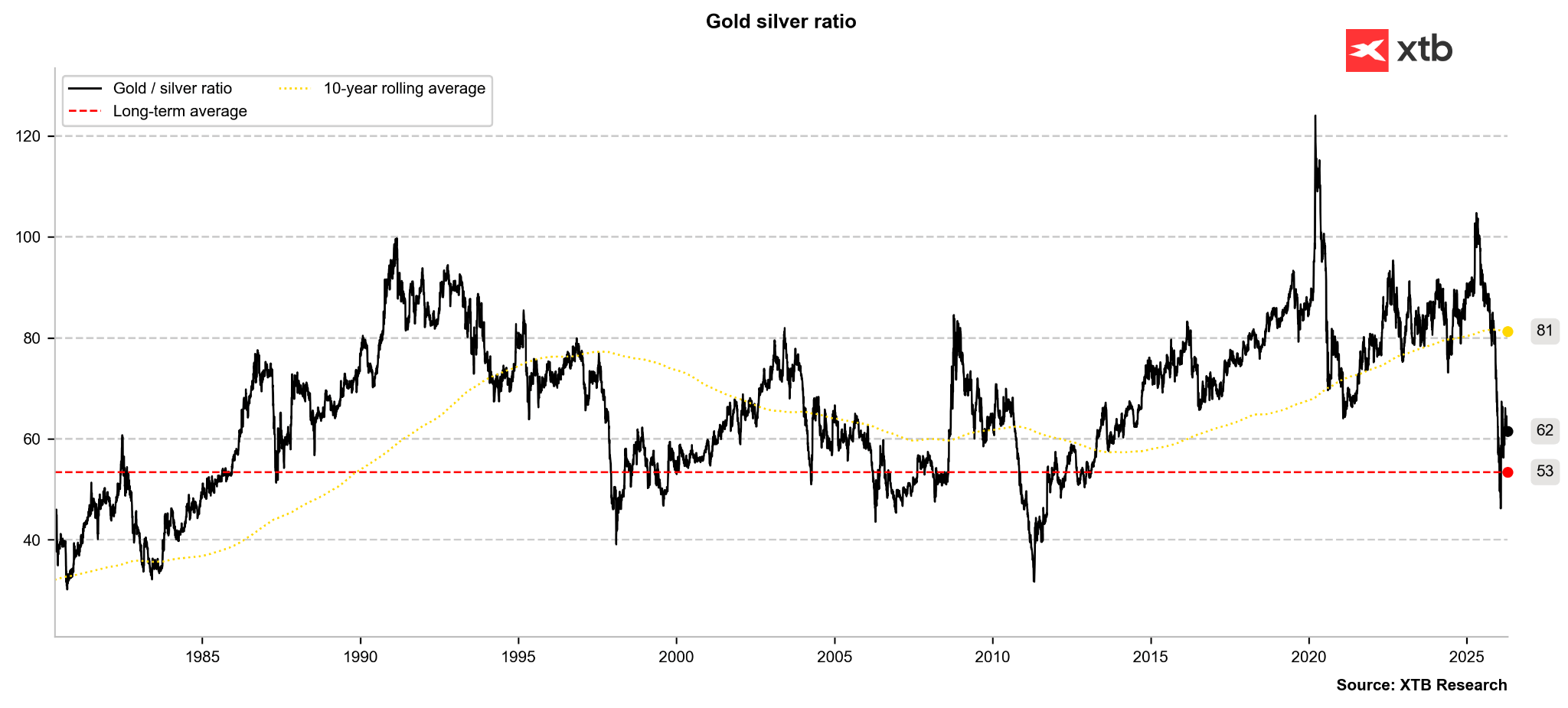 La ratio oro/plata sigue elevada, pero no ha mostrado un rebote dinámico hacia el rango de 70–80. La configuración actual refleja la de finales de los años 90; los precios eran significativamente más bajos entonces, pero se encontraban dentro de una tendencia alcista establecida. Fuente: Bloomberg Finance LP, XTB
