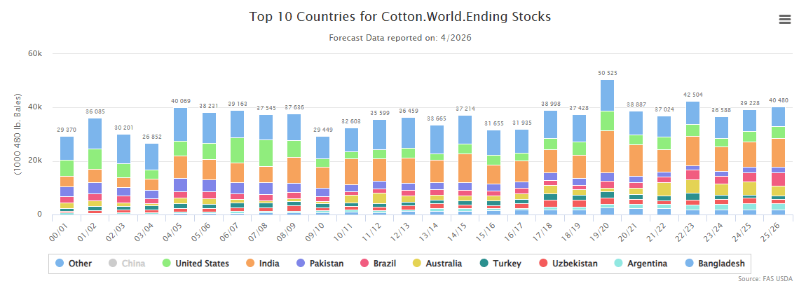 Se espera que los inventarios de algodón crezcan por segundo año consecutivo esta temporada. Además, excluyendo las temporadas 19/20 y 22/23, esto representaría el nivel de existencias más alto registrado (excluyendo China). Fuente: USDA