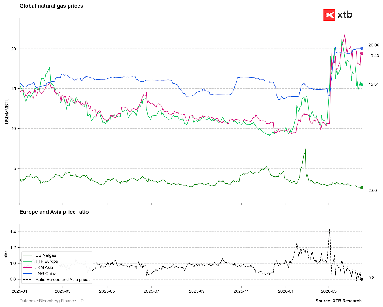 Los precios del gas en China y otros mercados asiáticos clave siguen siendo altos, mientras que los precios europeos están cayendo. Los altos precios en Asia pueden incentivar a los vendedores spot a redirigir cargamentos hacia los mercados asiáticos. Fuente: Bloomberg Finance LP, XTB