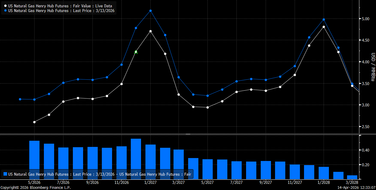 Durante el último mes, el contango se ha ampliado ligeramente, tanto en el corto plazo como en el contrato de enero, que suele representar los picos de precios. Cabe destacar que, a medida que el mercado transite hacia el contrato de julio, la estructura de la curva forward permitirá ajustes de precios sin la carga de costes significativos de roll. Fuente: Bloomberg Finance LP